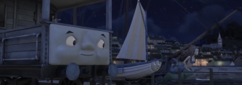 また、ファンの間では「スキフが自力で動いている」と指摘する人が多かったですが、スキフの場合、機関車や自動車とちがってずっと軽いですし、帆が開いている状態で、風で押されているのだろうと解釈できます。というか、帆の動きでそれがわかります。ファンが気づかないくらい、アニメーションが実に巧妙なんですよね。